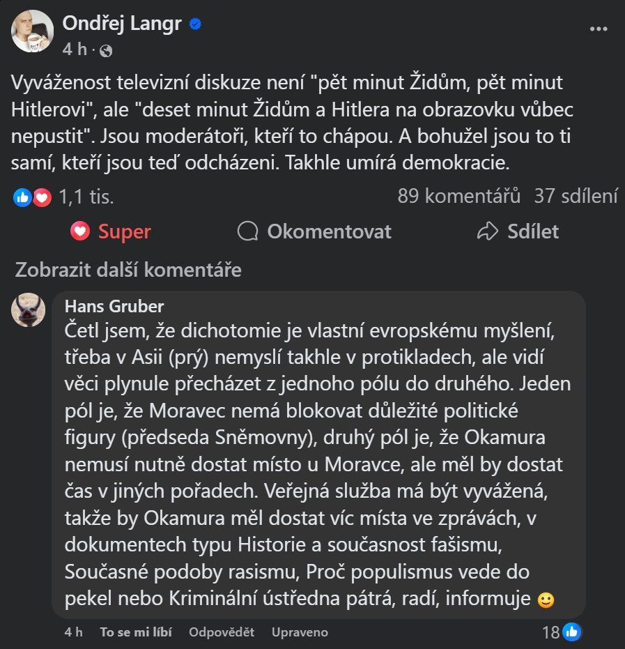 Vadí mi to, jak si určití lidé nárokují čas v médiích a prostě si ho vymrčí. Např. v době covidu diskuze v poměru 1:1 vyvolávaly v lidech dojem, že počet odpíračů očkování je stejný jako lidí očkování podporujících. To píši jen jako takovou paralelu s tou politikou. Okamura, který nikdy na žádnou otázku neodpověděl, každou diskuzí rozvrátil, jeho strana (tedy teď "nekoalice") získala nízké procento a on se chová jako pán světa. Já se vždycky stydím za něj.