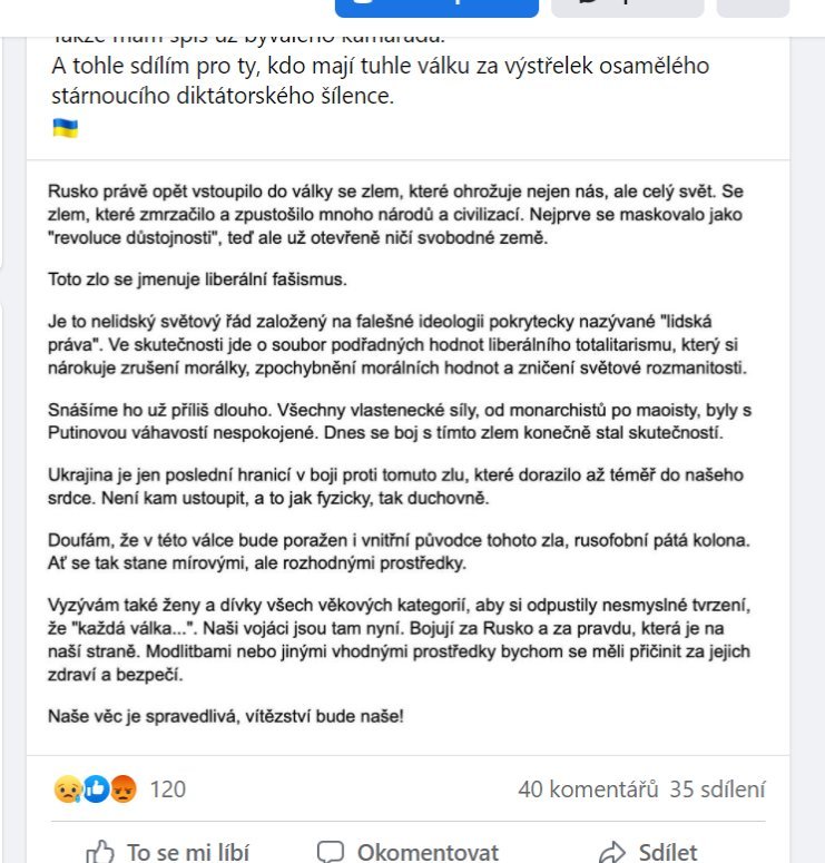 "Mám kamaráda. Jmenuje se Vladimir.Bydlí v Petrohradě a je právník. Mimo to je baťůžkář a cestovatel (seznámili jsme se, tušímže v Laosu), spisovatel a překladatel. Přeložil do ruštiny mimo jiné řadu knih Terryho Prachetta. Celkově fajn člověk.Ale taky Rus.A tohle je překlad jeho statusu z dnešního rána.Takže mám spíš už bývalého kamaráda.A tohle sdílím pro ty, kdo mají tuhle válku za výstřelek osamělého stárnoucího diktátorského šílence."