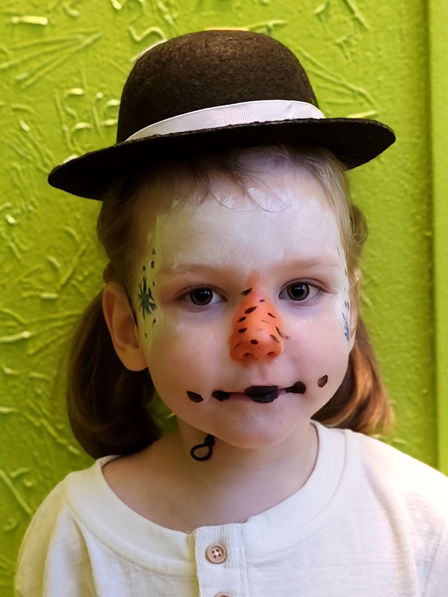 Šárka jako sněhulák. Původně měla nabílenou i spodní část obličeje,ale tu stihla rozmazat límcem bundy už cestou do výtahu. Uhlíky na puse jsou namalované mýma očníma linkama ve fixu, takže ty to vydržely ![]()