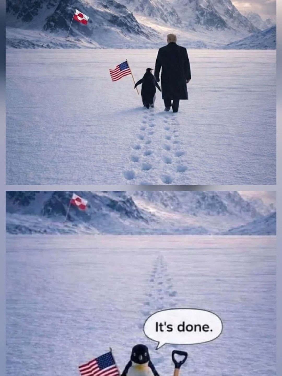 Zuzuli ne, ta první polovina, kde se Trump vede s tučnákem za ruku je originální post Bílého domu v době, kdy se chystal na anexi Gronska. Jakože opravdu to bylo na jejich stránkách. Utržili hrozný posměch, protože v Grónsku tučnáci nežijí, že. A tohle je vtip k tomu, no.