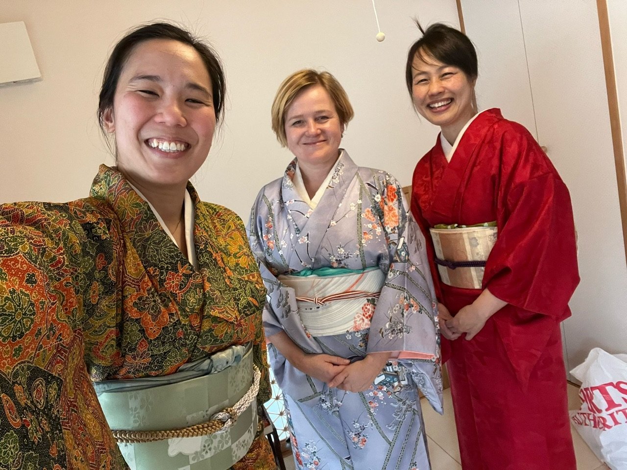 No, cestu v kimonu jsme nakonec vzdaly, hlavně proto, že selhala řidička a musíme jet vlakem, takže časově nemáme šanci se stihnout obléct, ale rozhodly jsme se, že budeme chodit v kimonu na lekce!