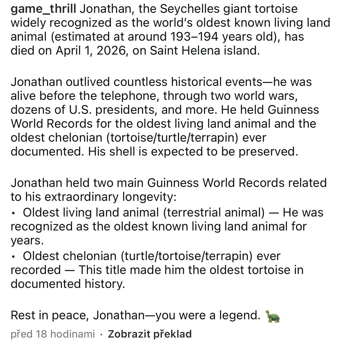 Zemřel Jonathan, nejstarší známý živý tvor.
