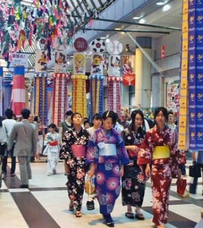 Říkala jsem si, že najdu nějaké slavnosti, ale než se v tom prohrabu (je fakt těžké vybrat jen jednu-dvě fotky), tak sem vrznu krásný svátek Tanabata matsuri. Úplně nejkrásnější oslavy jsou totiž v našem městě! :-) Po celé hlavní promenádě visí takovéto dlouhé ozdoby, fakt všude, často jsou celé udělané z origami. Je věcí cti, aby své zástupce měly všechny školy, firmy a instituce. Je to opravdu nádhera a typicky japonsky velmi pomíjivá, protože jsou vesměs z papíru a po tom týdnu musí být k nepoužití, proplétají se tam tisíce lidí. (a Tanabata matsuri je oslava jediného dne v roce, kdy se na obloze potkají Altair a Vega-dva dávní milenci rozdělení mléčnou dráhou).