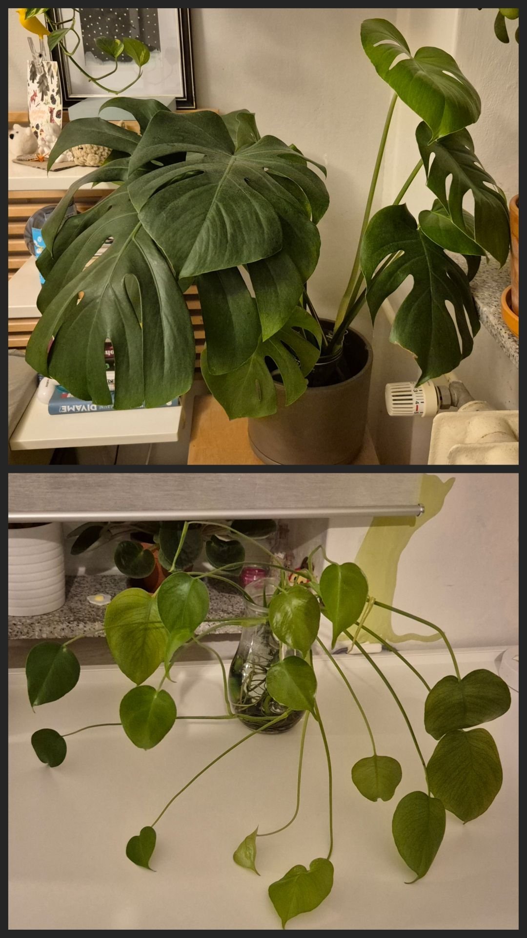 Mha pro představu monstera u okna a 3,5m od okna. Obě jsou jen ve vodě, ta u okna vyhazuje stále děrované listy.