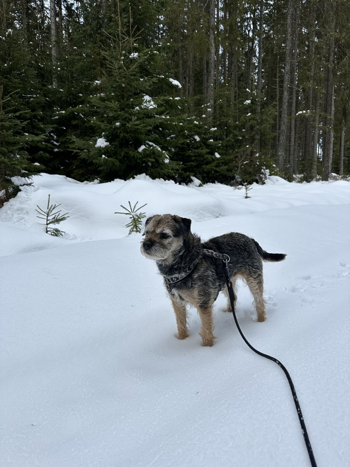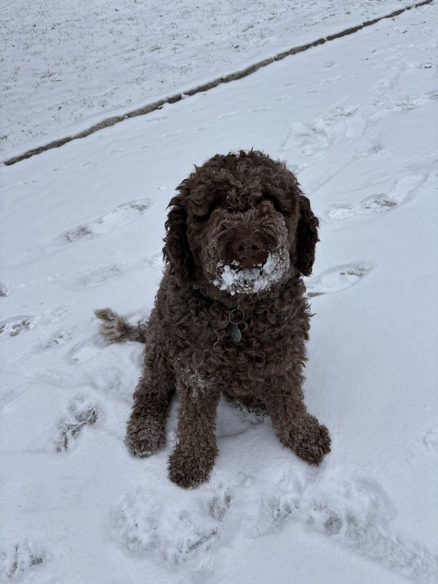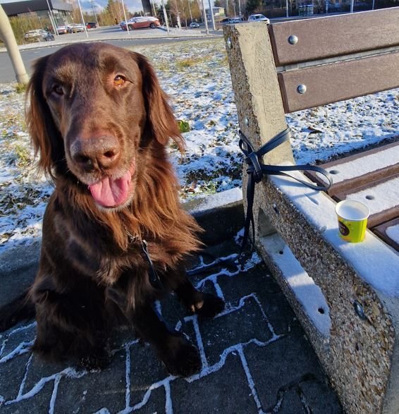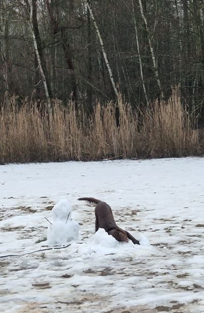 Psice sníh miluje, ale minulý týden musela se mnou do práce. Čumák je šedý od blbě utřeného jogurtu, nirmálně je černy jak uhel.